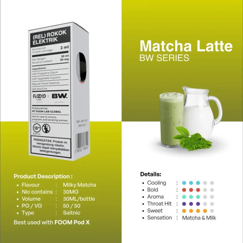 Buat kamu para pecinta matcha, pasti bahagia banget pas nemuin liquid Foom Matcha Latte. Liquid salt nic creamy dingin yang satu ini berkolaborasi dengan Boy William, seorang influencer terkenal di Indonesia.